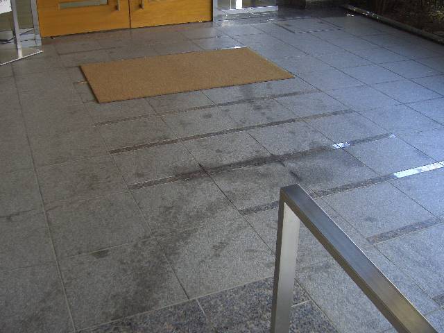 - マンションのエントランスの御影石バーナー床に油を垂らしたような濡れジミが