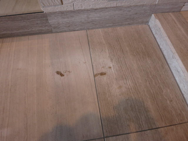 - ブティック入口大理石床に植木鉢から流れ出た水の茶色いシミが