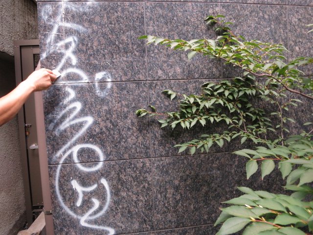- マンションの御影石本磨きの外壁にペンキのスプレーによる落書きが