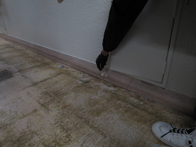 マンションの大規模修繕工事に伴い、通路の長尺シートの貼り換えがあり、テラゾーの巾木部分は、現状のままということなので巾木の汚れ除去をしてほしいと管理組合の担当者様より依頼が入りました。