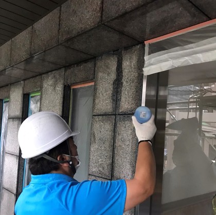 今回の施工でまず一番大切な事は、このシール材自体がシミを作ってしまっているので、このシール材をしっかりと切り取ることが第一課題になります。