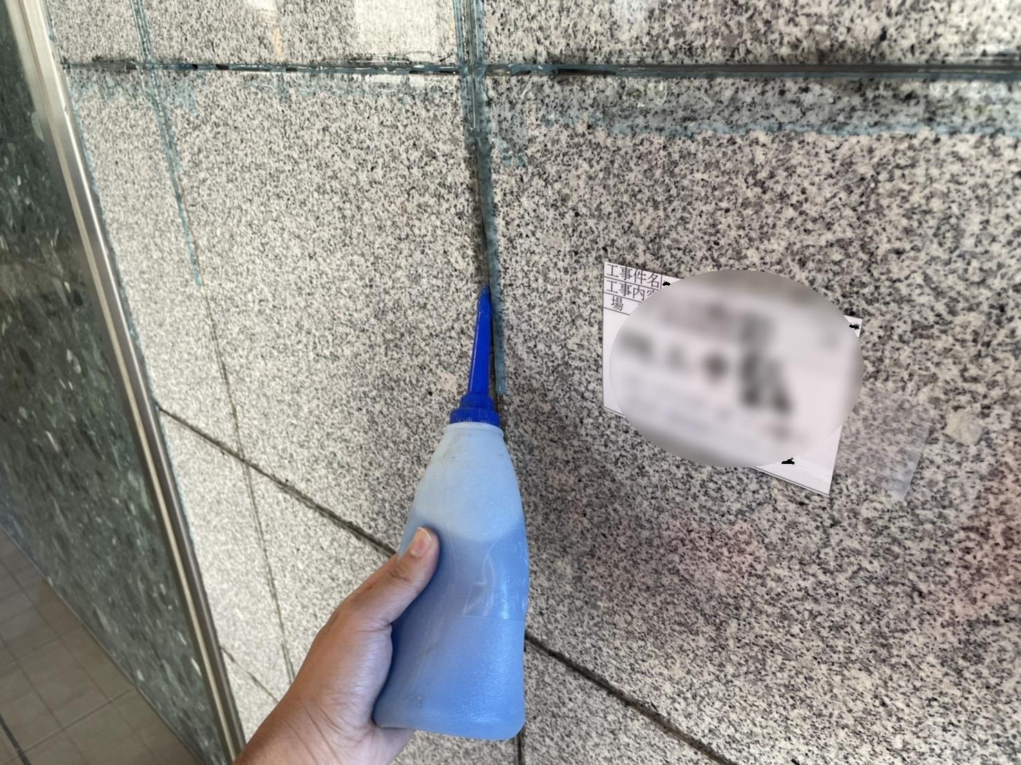 - 白御影石の本磨きの目地回りに付着したシールのシミ