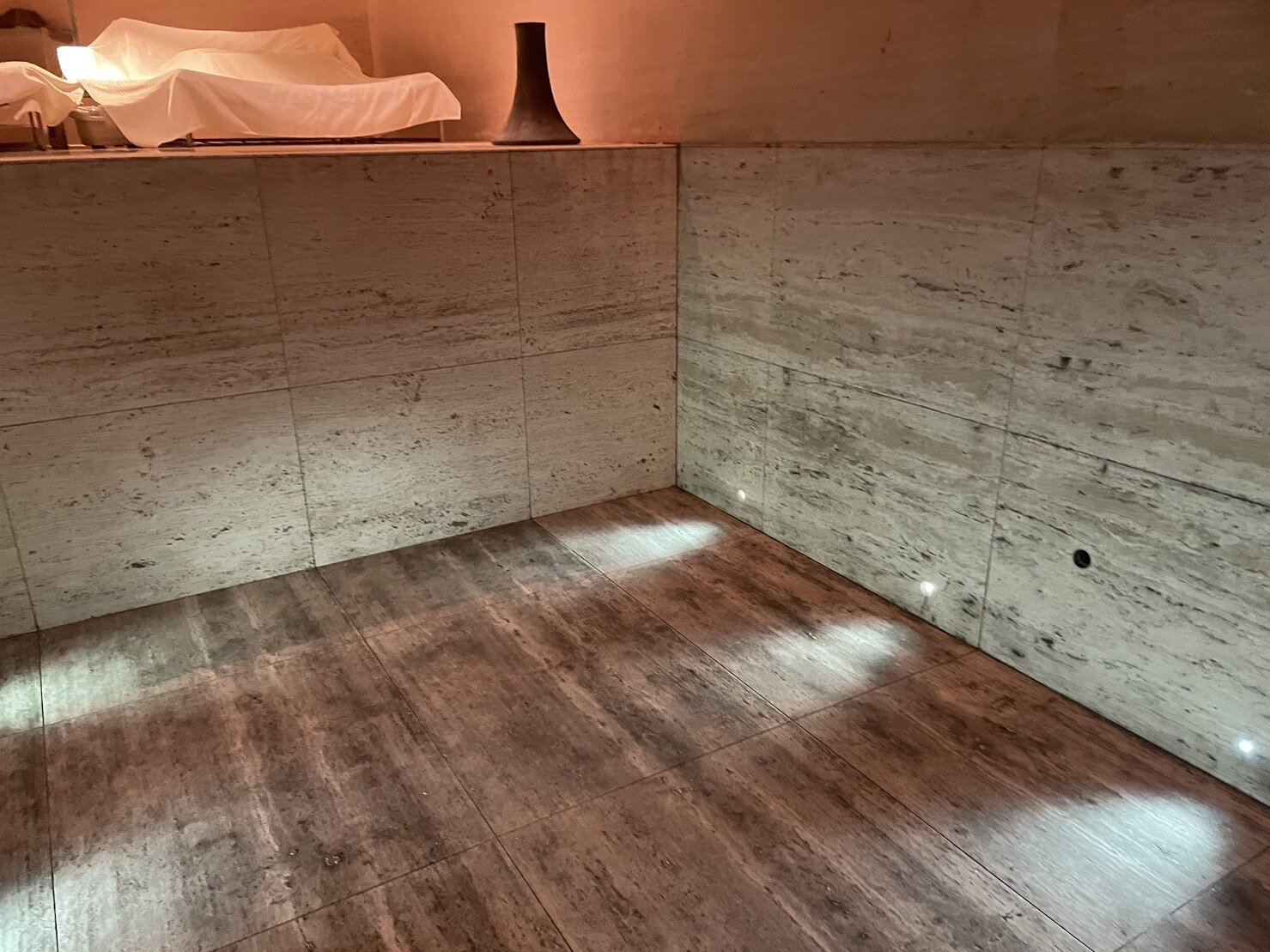 - 浴室の大理石壁に目立つ茶シミ、サビ抜き施工で白大理石本来の白さ復活
