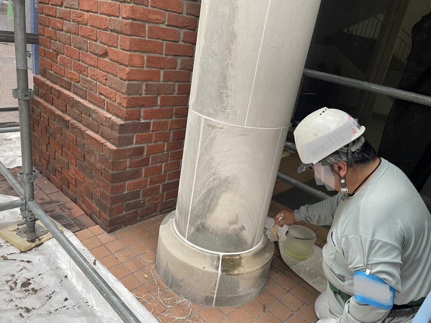 ① 石材用カビ抜き剤の塗布(反応工程) まずは、石材表面および表層近くに定着したカビや菌類を除去するため、ライムストーン専用の強力な「カビ抜き剤」を使用しました。市販の塩素系薬剤などは石材を傷める可能性があるため、必ず石材専用の薬剤を選択します。 薬剤を刷毛で丁寧に塗布し、一定時間の反応時間を設けます。熟練の職人が石の目を確認しながら均一に薬剤を浸透させていきます。この工程により、表面を覆っていた黒ずみやカビ汚れの大部分を分解・除去することが可能となります。