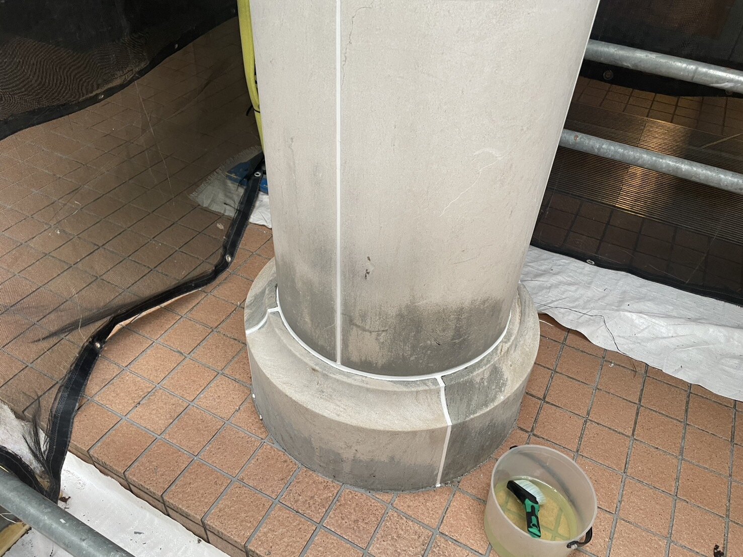 - マンションの外構の白タイル床に付いた、タイヤ痕・オイルシミ抜き
