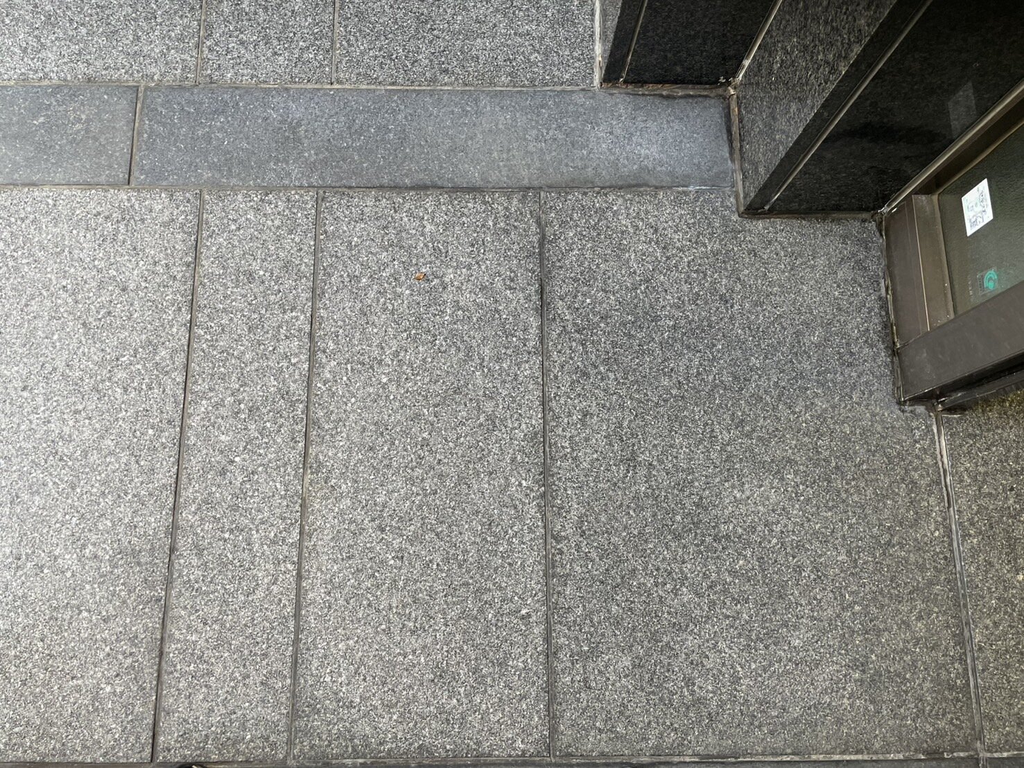 - 店舗入り口前の黒御影石バーナー仕上げの床に濡れジミが