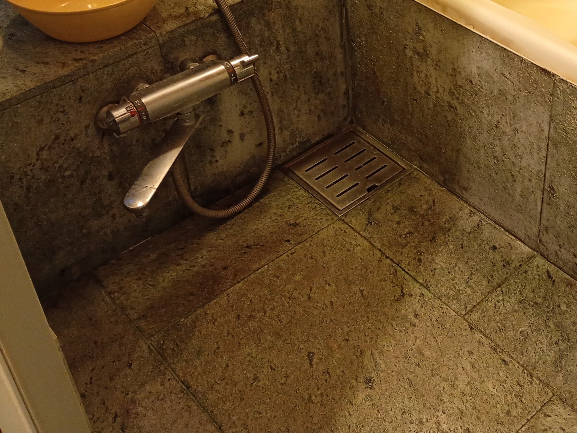 - 古い温泉施設のタイルん付着した茶色い汚れ