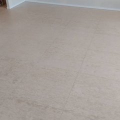 マンションのリビングに使用されたライムストーンの床に、四角いマット跡のシミが残ってしまっているという現場での施工事例をご紹介します。写真でもわかる通り、マットが置かれていた部分とそれ以外の部分で色味に明らかな差が生じており、退去後の通常清掃では除去しきれない状態でした。