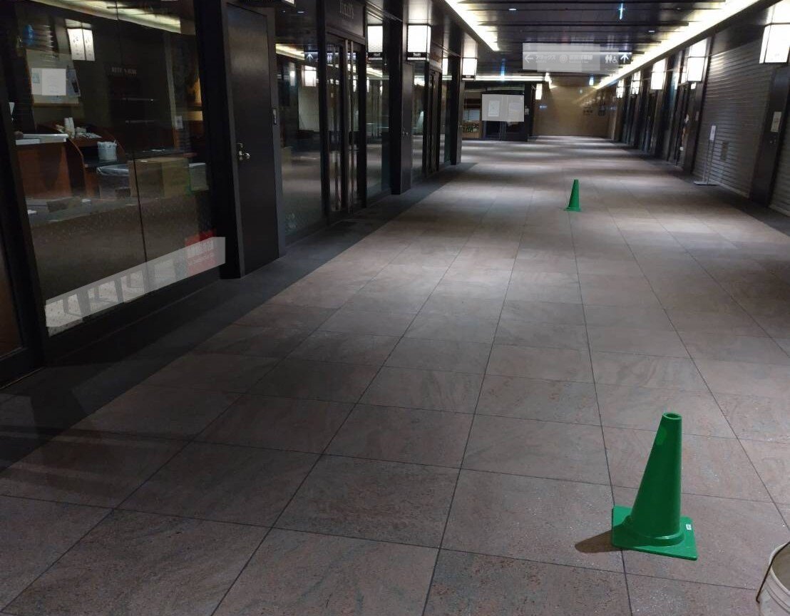 - 飲食店からの油で御影石のバーナー仕上げ共用通路床が黒ずんで