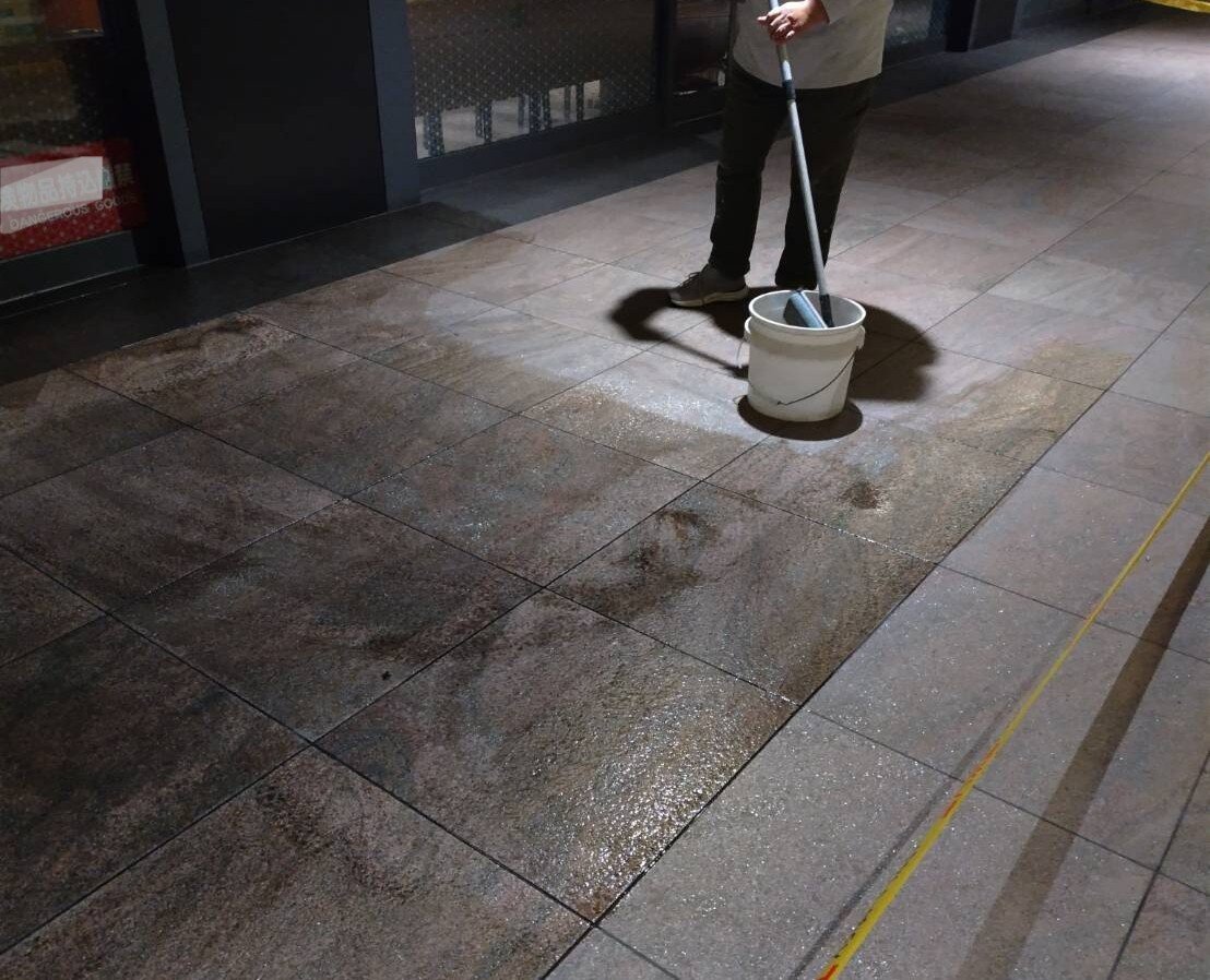 - 白御影石バーナー仕上げの床にモップ掛けを続けて全面的な汚れに