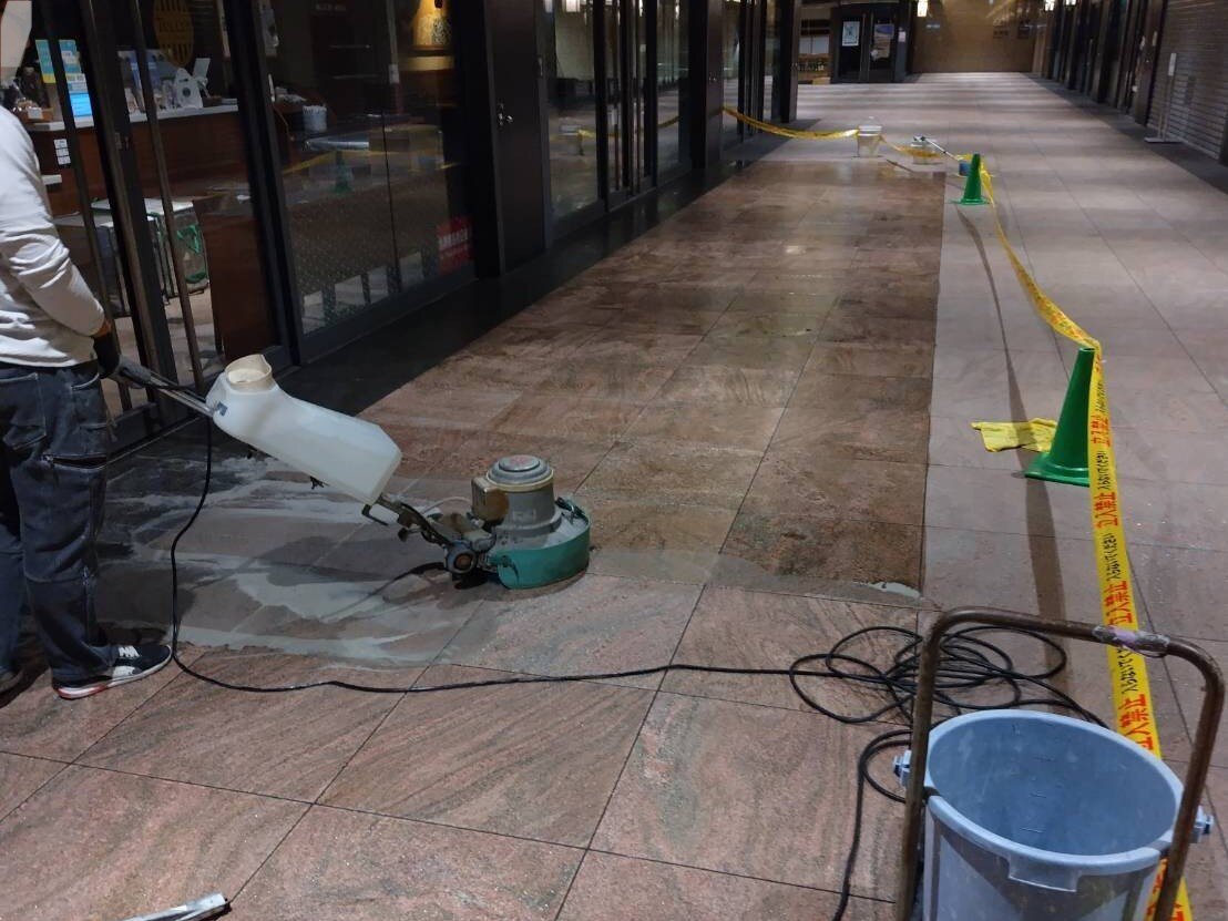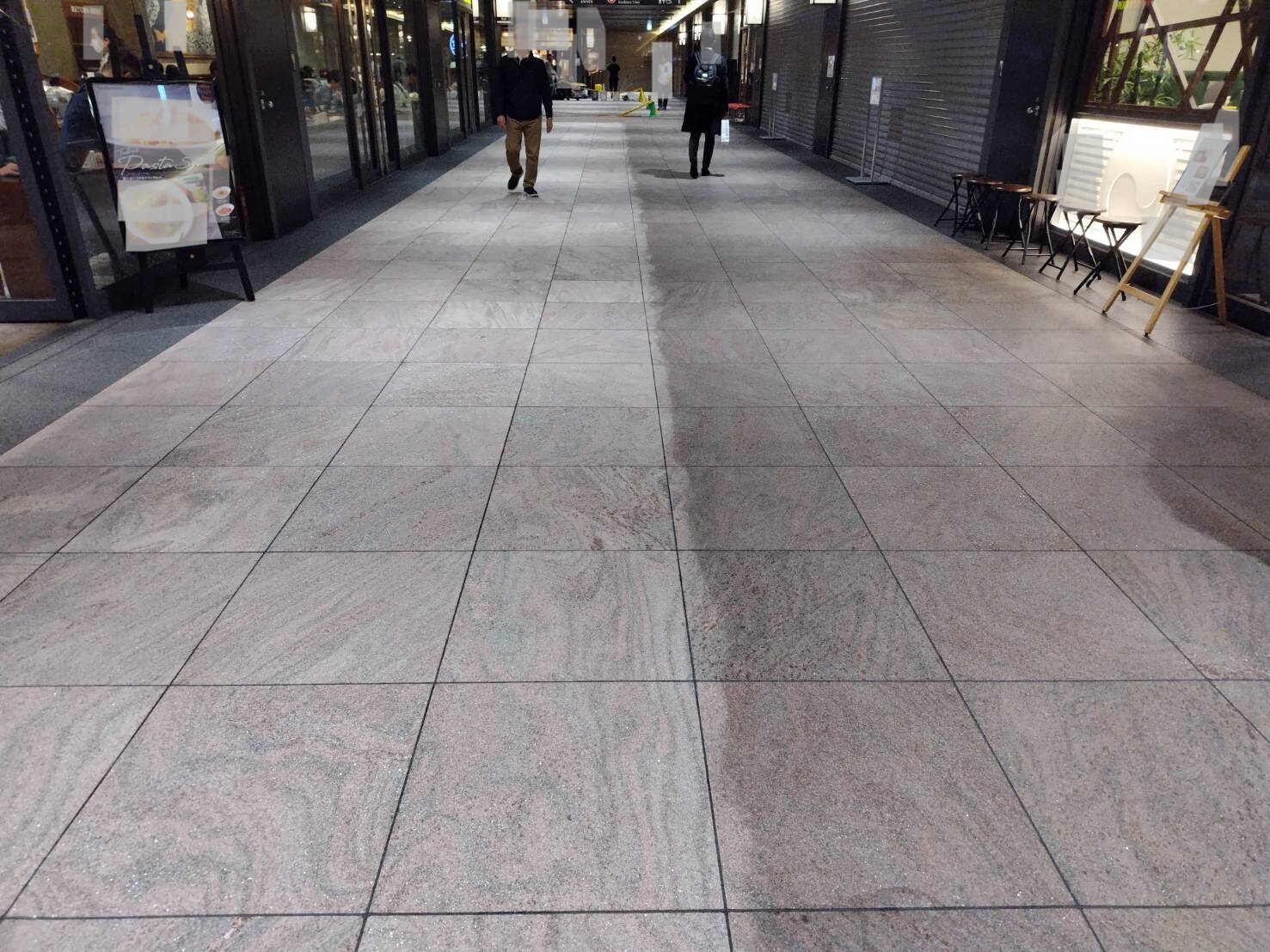 先日テスト施工を行った商業施設共用部の御影石バーナー仕上げの床ですが、その仕上がりをご評価いただき、本施工へと進むことになりました。