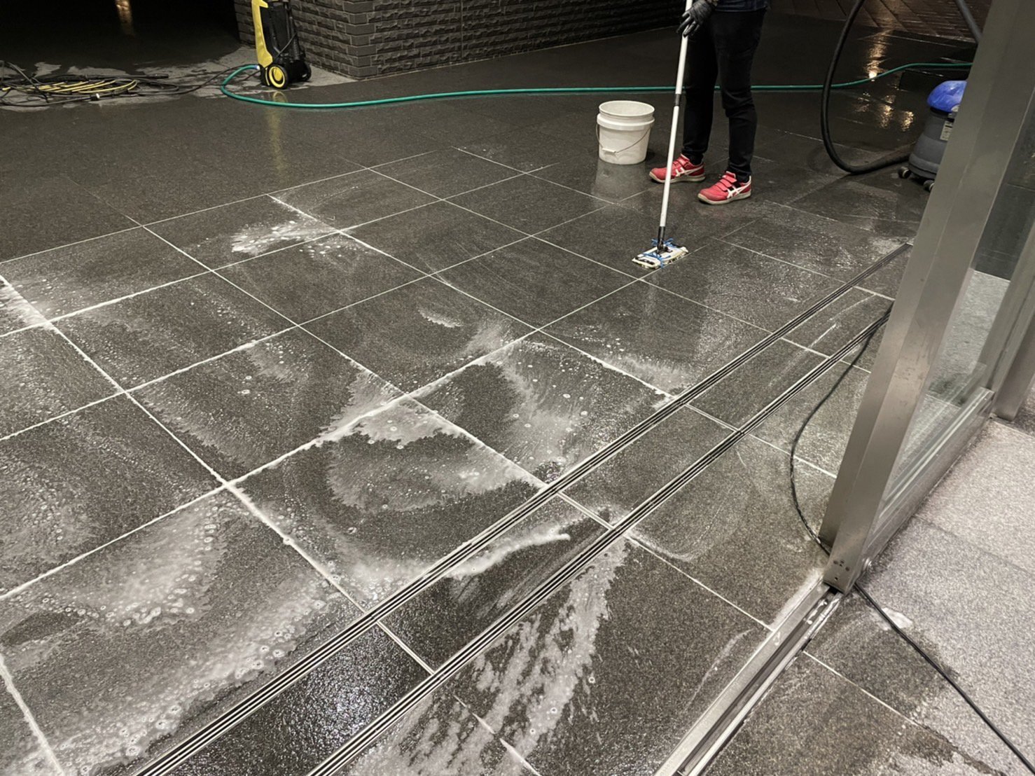 商業ビル玄関床が黒く!黒御影石にこぼれた「機械油」のシミ抜き施工